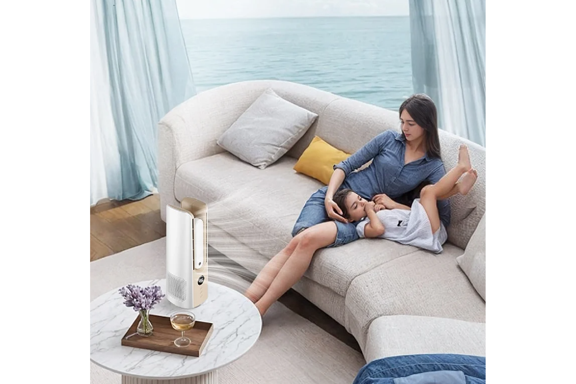 HEPU HP-F28, pervanesiz fan teknolojisi ile sessiz serinlik sunarken entegre buharlı nemlendirme sistemi sayesinde ferahlık etkisini artırır. Ortasında yer alan su haznesi ile ince buhar yayarak ortamın nem dengesine katkı sağlar. USB üzerinden şarj edilebilen yapısı ve dijital ekranlı kontrol paneli ile ev ve ofis kullanımı için modern ve pratik bir çözümdür