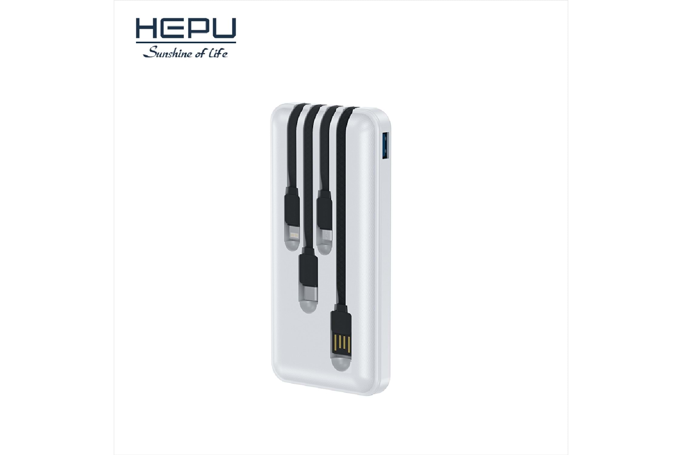 HEPU HP986, 10.000 mAh kapasitesi ve dahili çoklu kablo tasarımı ile pratik ve kompakt bir taşınabilir şarj çözümüdür. Üzerinde entegre bulunan kablolar sayesinde farklı cihazları ekstra kablo taşımadan kolayca şarj edebilirsiniz.