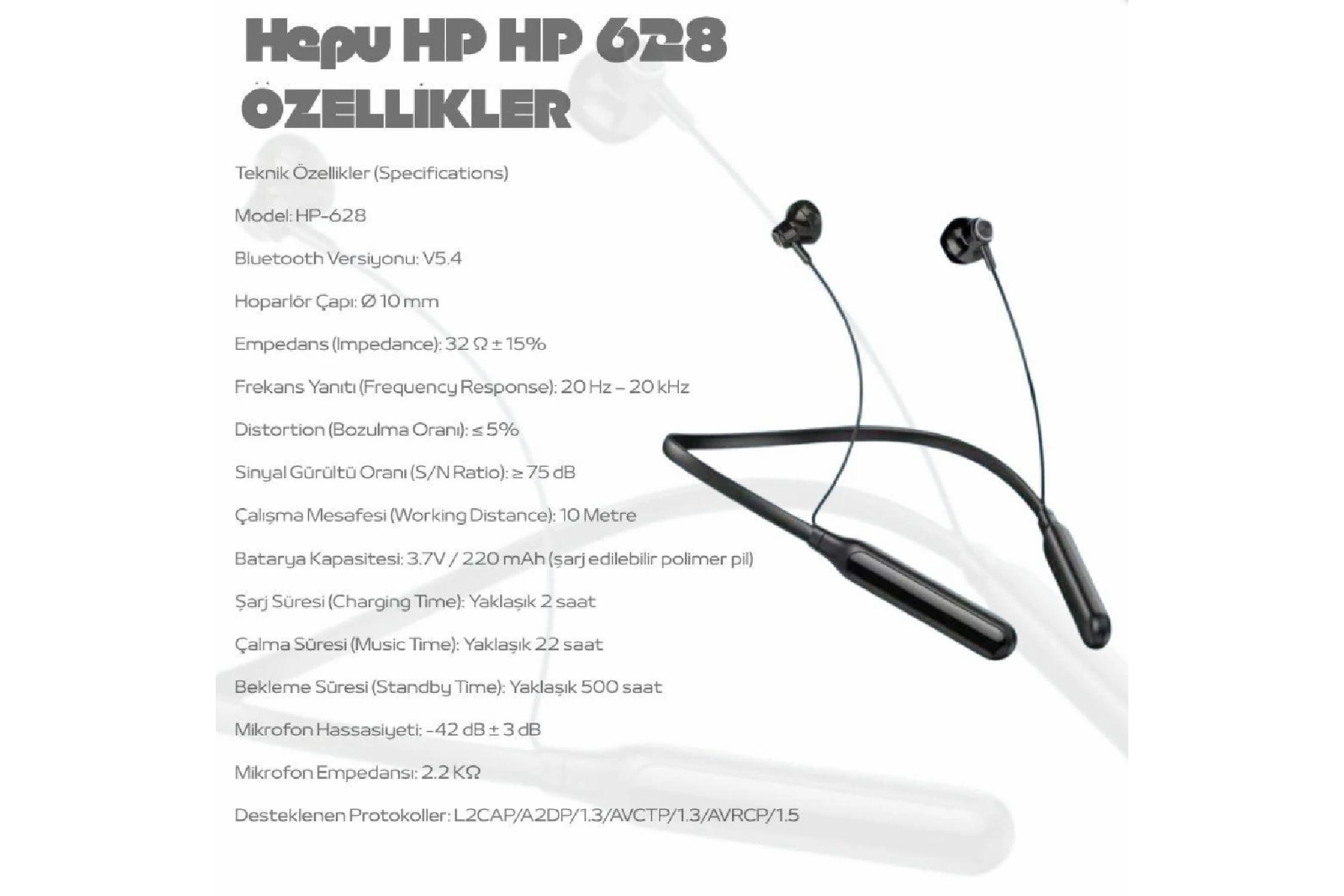 HEPU HP-628, spor ve günlük kullanım için özel olarak tasarlanmış, uzun pil ömrü ve yüksek ses kalitesi sunan boyun askılı bir Bluetooth kulaklıktır. 22 saate kadar kesintisiz müzik dinleme süresi ile gün boyu kullanım imkânı sağlar. Bluetooth 5.4 teknolojisi sayesinde hızlı, kararlı ve düşük gecikmeli bağlantı sunar. Esnek boyun bandı yapısı sayesinde spor sırasında veya günlük kullanımda konforlu ve dengeli bir deneyim sağlar.